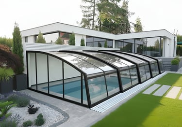 الحل الأمثل لمن يبحث عن الفخامة والرحابة. يتميز بتصميمه المرتفع الذي يمنحك مساحة إضافية حول المسبح، مما يسمح لك بالاستمتاع بجلسات عائلية مريحة وحركة حرة تماماً داخل التغطية بغض النظر عن حالة الطقس.