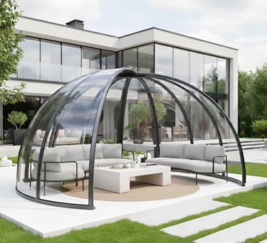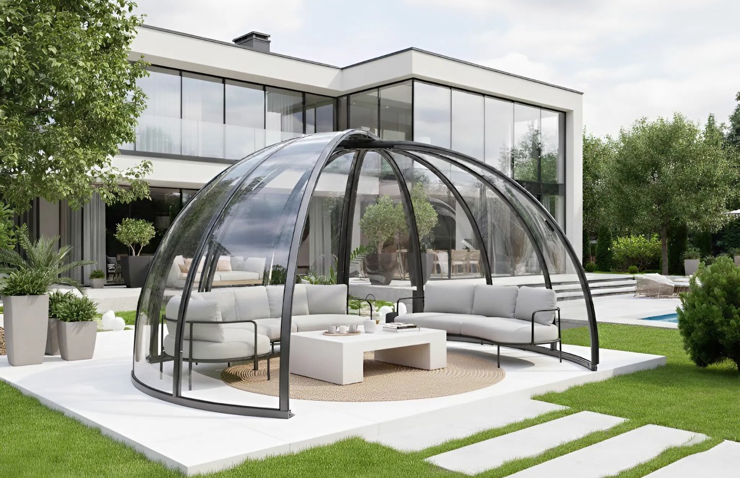 A modern panoramic dome design offering a 360-degree view. It is an ideal solution for outdoor lounges, round pools, or luxury garden rooms, providing protection from the elements while maintaining an outdoor feel.