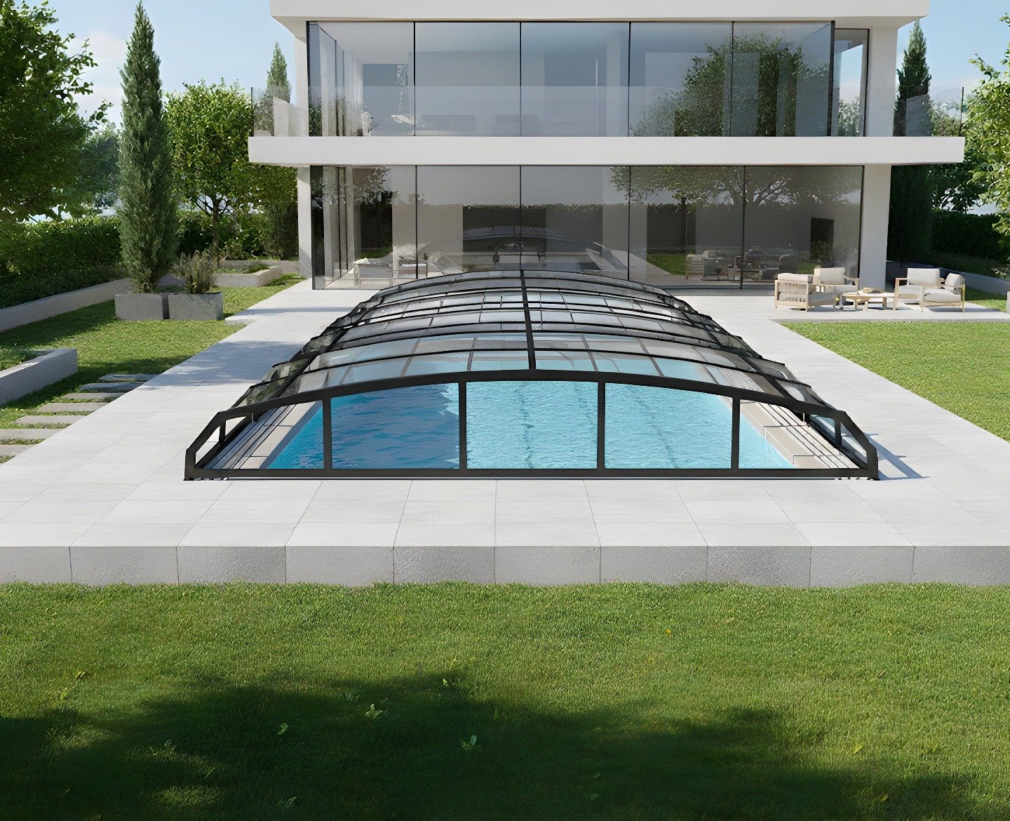 Teleskopik Hareket Sistemi: Birbirinin içine geçebilen modülleri sayesinde raylar üzerinde zahmetsizce hareket eder. Havuzunuzu saniyeler içinde ister tam açık, ister tam kapalı konuma getirebilirsiniz.